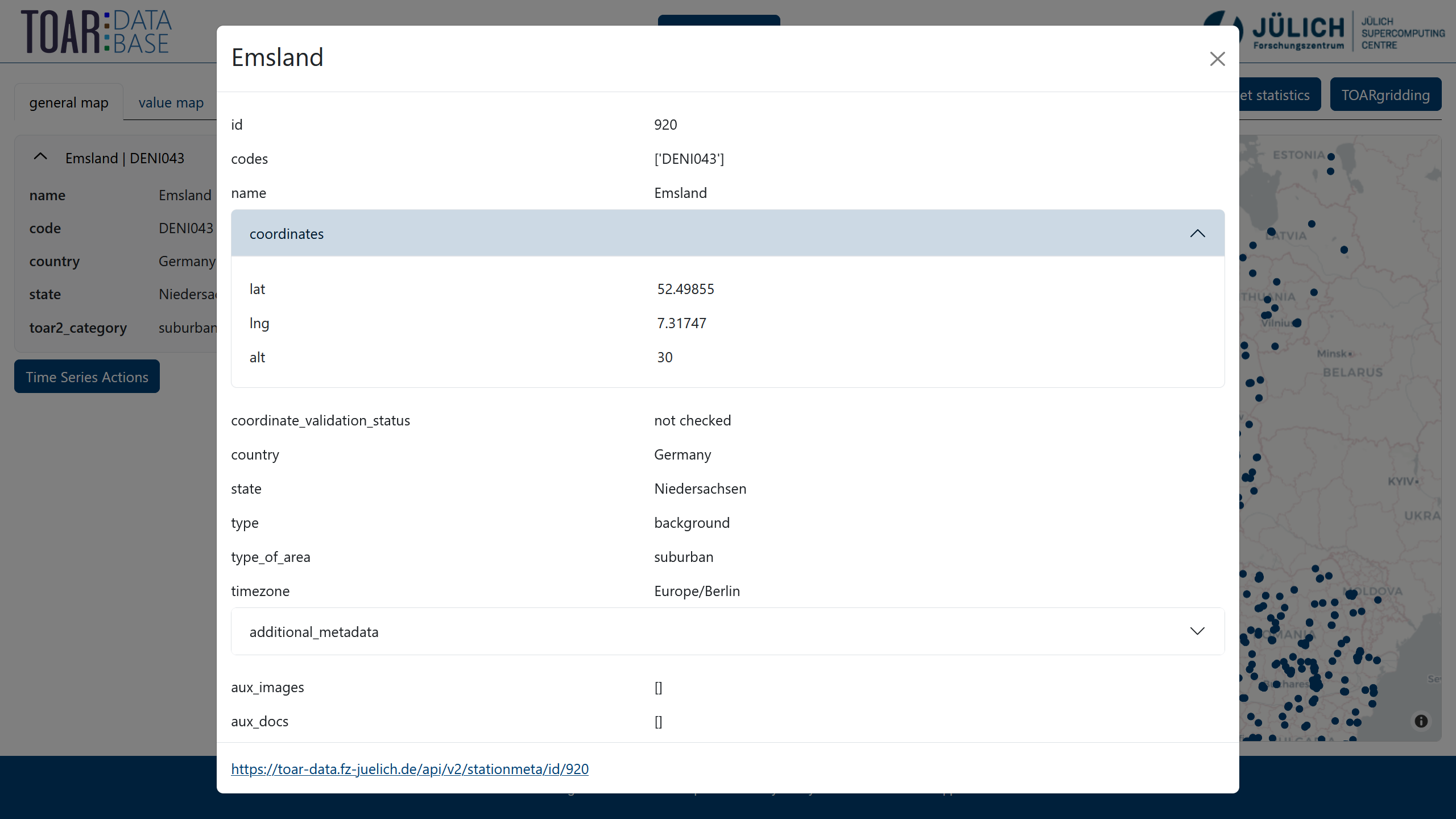 In the bottom footer of the modal you also find a link to the API from which the metadata is received, in this case station 920: https://toar-data.fz-juelich.de/api/v2/stationmeta/id/920.
