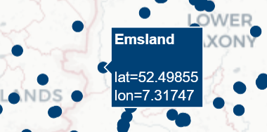 To select a station, simply left-click on it. The selected station will then be highlighted in orange and will remain in front of other unselected stations. Therefore, you will also see it in dense regions or when you zoom out again. If you want so select a different station you may just click on another station displayed on the map and it switches to the new selected station. You can deselect a station either by clicking the red ‘x’ next to its information or by clicking on it again on the map.