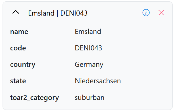 There you will see more metadata about the station, such as the name, station code, country and state, as well as the toar2_category. The toar2_category is a classification of the type of area of the station through a machine learning algorithm.